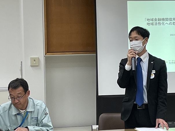 野崎賢一氏(大分県信用組合 高田支店支店長)が「地域金融機関信用組合が行う、地域活性化への取組みについて」をテーマに報告しました。