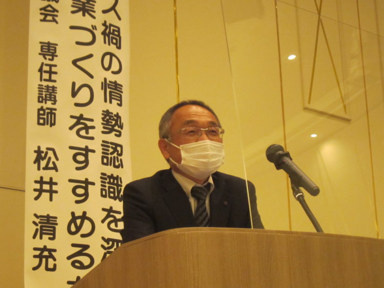 次に松井清充氏(中小企業家同友会全国協議会 専任講師)が「新型コロナウイルス禍の情勢認識を深め、どのような企業づくりをすすめるか」をテーマに講演しました。