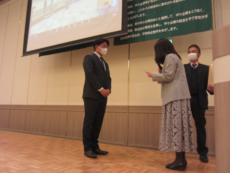 議案審議に続いて、第2期役員育成研修会の修了生8名を表彰しました。その後、今年度から新しくなった大分同友会のホームページ説明を宮野大樹広報委員長が行いました。