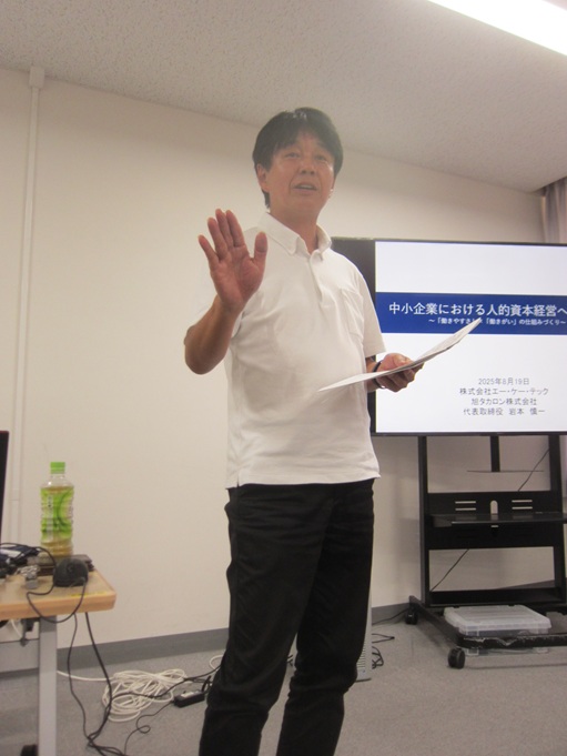 岩本慎一氏(旭タカロン(株)代表取締役)が「「中小企業における人的資本経営への挑戦」~「働きやすさ」×「働きがい」の仕組みづくり~」をテーマに報告しました。