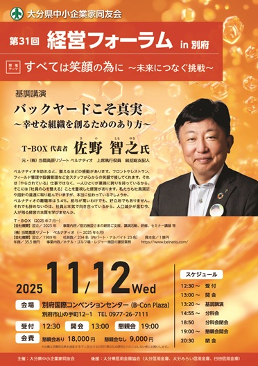 11月12日(水)13時から別府国際コンベンションセンター(B-Con Plaza)で、第31回経営フォーラムを「バックヤードこそ真実~幸せな組織を創るためのあり方~」をテーマに開催致します。