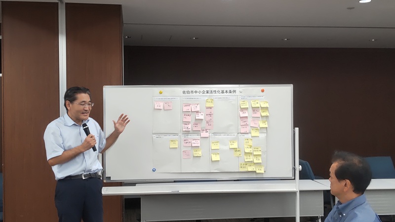 ワークショップでは、賃上げへの対応、世代交代、人口減少、水害が多い、人材不足、後継者不足、若手人材の不足、地域外からの資金流入、技術の承継などの課題が出ました。最後に「地域=商圏、地域=生活圏であり、地元で働ける、地元に住み続けられる地域経済循環をつくることが大切です。佐伯市中小企業活性化基本条例の真の目的は地域活性化です。「他人事」から「自分事」に変える必要がります」と意識を変えることの重要性を訴えました。行政の担当者、他団体の参加者と一緒にグループワークを行うことで、お互いを知る良い機会になりました。
