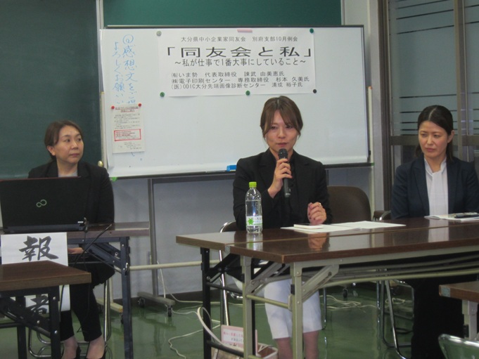 諫武 由美恵氏((有)いま勢 代表取締役 )、杉本 久美氏((株)電子印刷センター 専務取締役)、清成 裕子氏((医)ODIC大分先端画像診断センター)が「同友会と私~私が仕事で1番大事にしていること~」をテーマに報告しました。