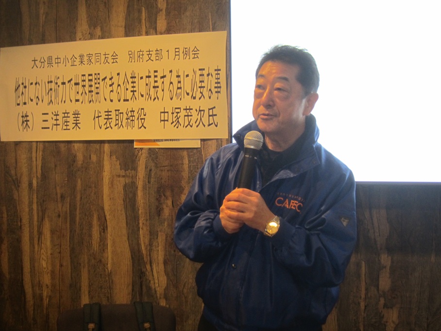 中塚茂次氏((株)三洋産業 代表取締役)が「他社にない技術力で世界展開できる企業に成長する為に必要な事」をテーマに報告しました。